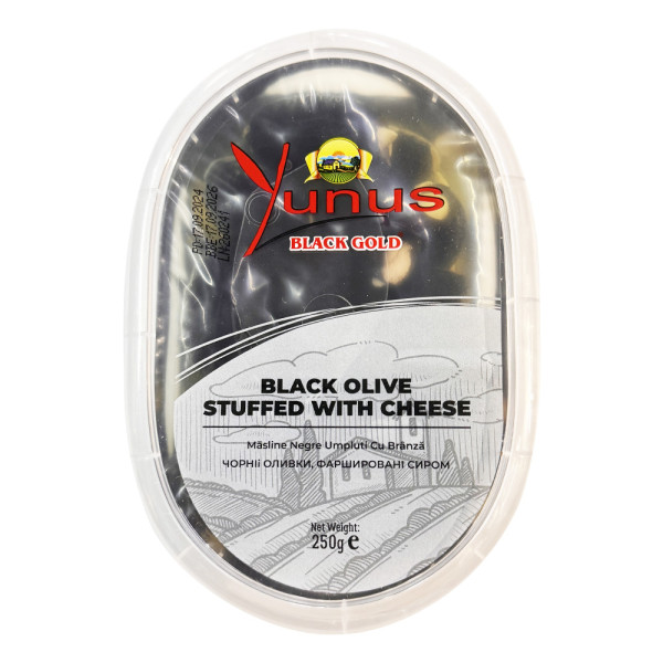 Скуштуйте поєднання ніжного сиру та насиченого смаку добірних чорних оливок від Yunus. Завдяки сирній начинці оливки стають ще більш ароматними, м’якими та ідеальними для святкових тарілок, повсякденних перекусів або кулінарних експериментів. Продукт подається у зручній пластиковій упаковці 250 г, що забезпечує легкість зберігання та використання.